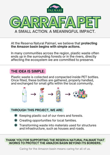 GarrafaPet is a community-based environmental initiative led by the Reserva Natural Palmarí that transforms everyday plastic waste into a meaningful opportunity for positive change. By encouraging people to collect and compact plastic inside PET bottles, the project prevents waste from reaching rivers and forests while promoting environmental awareness and responsibility. Once filled, the bottles are gathered and exchanged for small gifts, creating motivation and direct benefits for local families. Through this simple yet powerful action, GarrafaPet not only protects the Amazon basin but also turns waste into valuable materials that can be used for infrastructure and community development.
